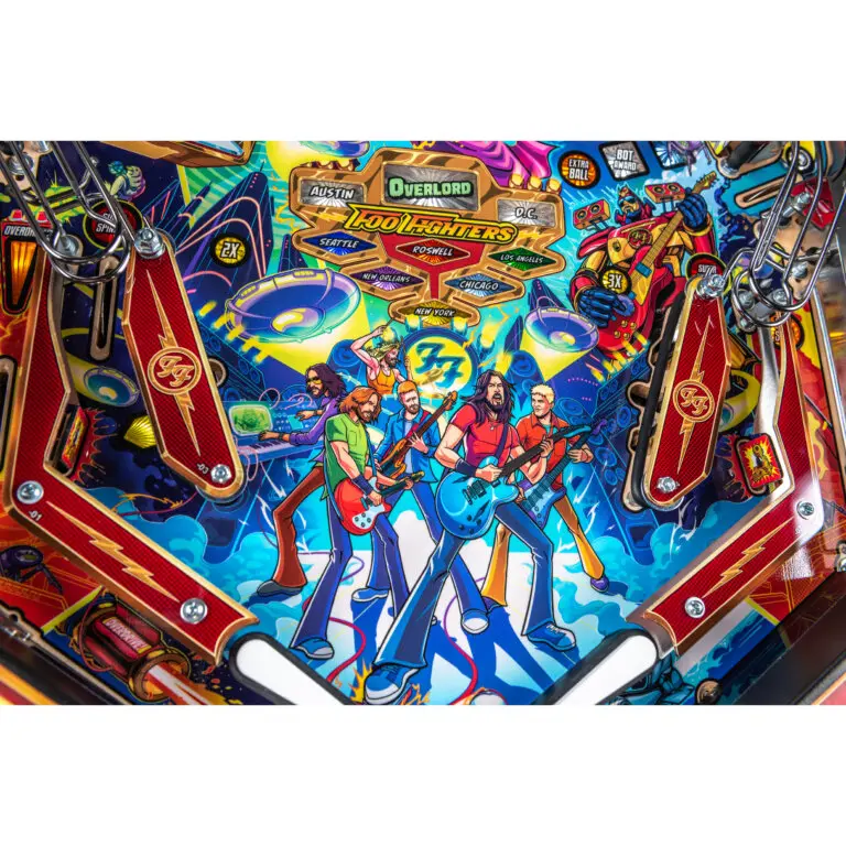 More than two years in the making and with creative input from the band’s own Dave Grohl, Nate Mendel, Pat Smear, Chris Shiflett, Rami Jaffee, and the late, great Taylor Hawkins, Stern’s Foo Fighters is a top-shelf pinball machine—and so much more. An entire new universe has been developed with jaw-dropping hand-drawn artwork and custom animations including “Foo Fighters Saturday Morning Action Time!”—a fictional TV series chronicling the band’s quest to save rock and roll… AND THE WORLD! Join Foo Fighters on this rescue mission to thwart the evil, mysterious alien Overlord and his army of bots. Search the Area 51 upper playfield (Premium and LE models) to break into and unleash pinball chaos. Jump in the van for a righteous tour of duty to save humanity from extinction and let rock rule!