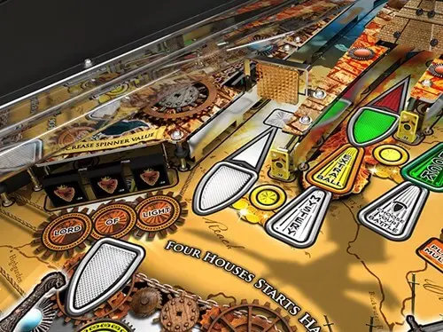 The Game of Thrones pinball machine is available in three models offering a variety of pricing and exclusivity for Game of Thrones fans and pinball collectors. All three models feature an animated, interactive dragon that roars, flies, and breathes fire through the magic of all-LED lit playfields. Players can slam the ball into the Battering Ram, attempting to break down the Castle Doors and grab features such as Super Jackpots, Wild Fire, and Playfield Score Multipliers. The animated mechanical Sword of Multiball holds back reinforcements until its time to attack. A bank of three Drop-Targets lights the Lord of Light Lanes to protect against side drains and awards other progressive features. A Kickback fires the ball in anger when struck.