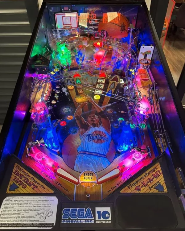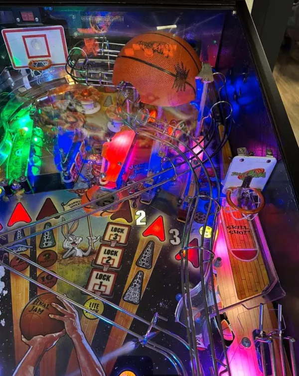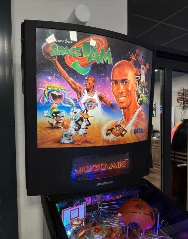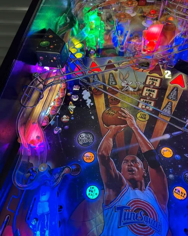 This pinball machine boasts a stunning, meticulously recreated cabinet that faithfully captures the essence of the original movie, complete with vibrant artwork featuring fan-favorite characters like Bugs Bunny, Michael Jordan, and the villainous Monstars.